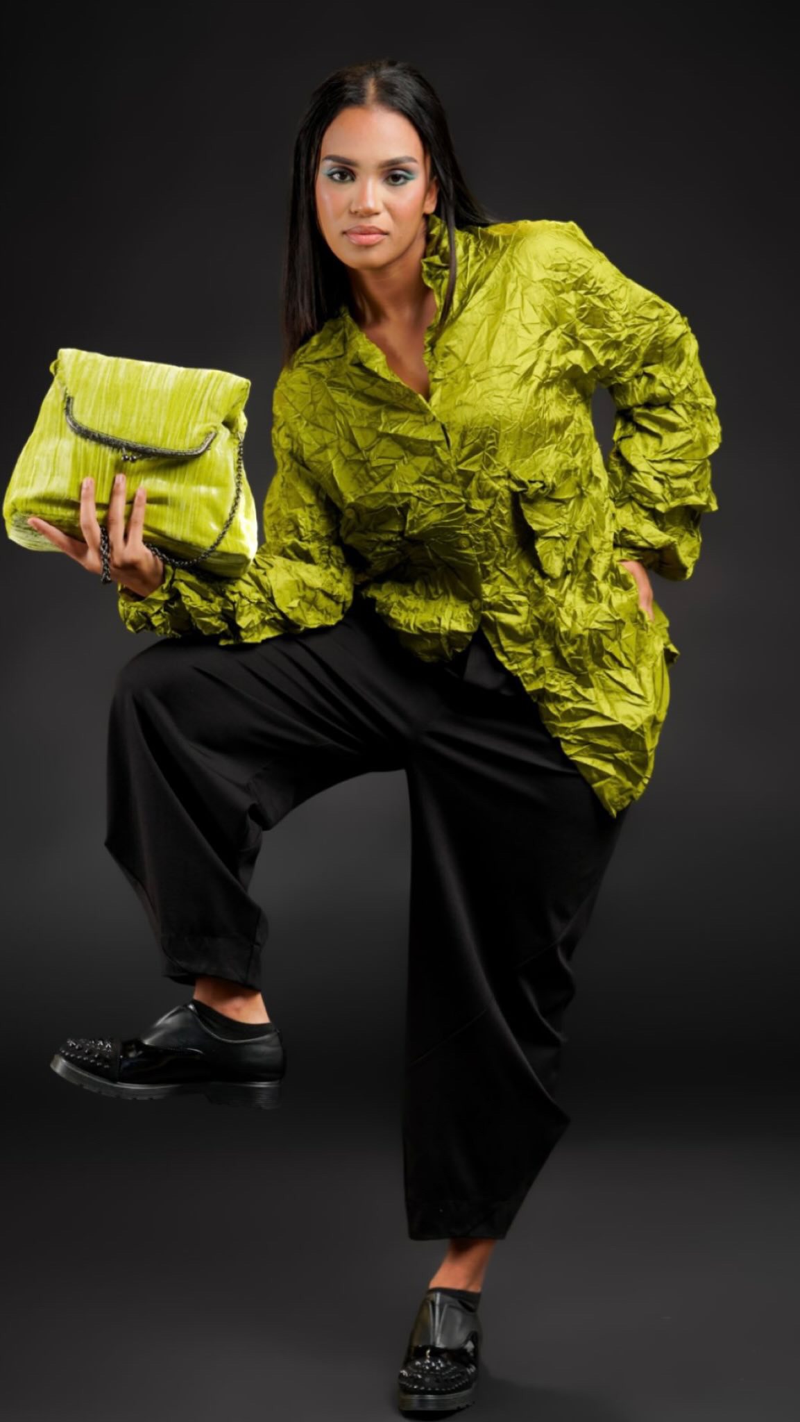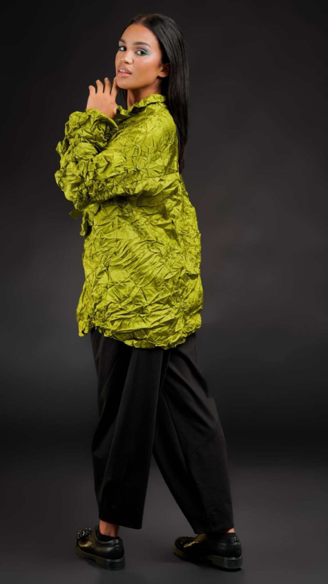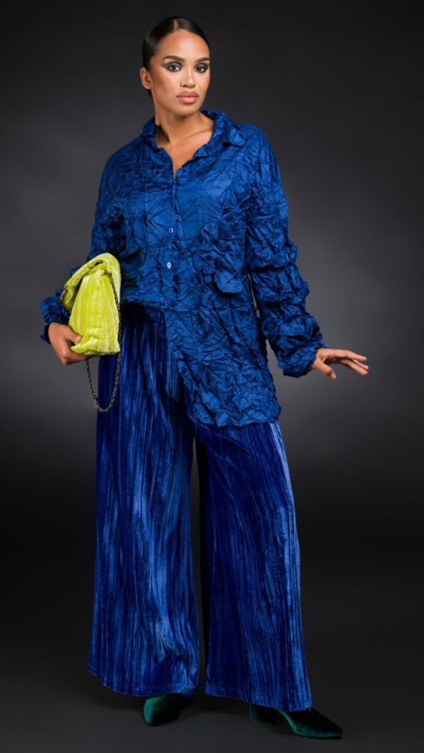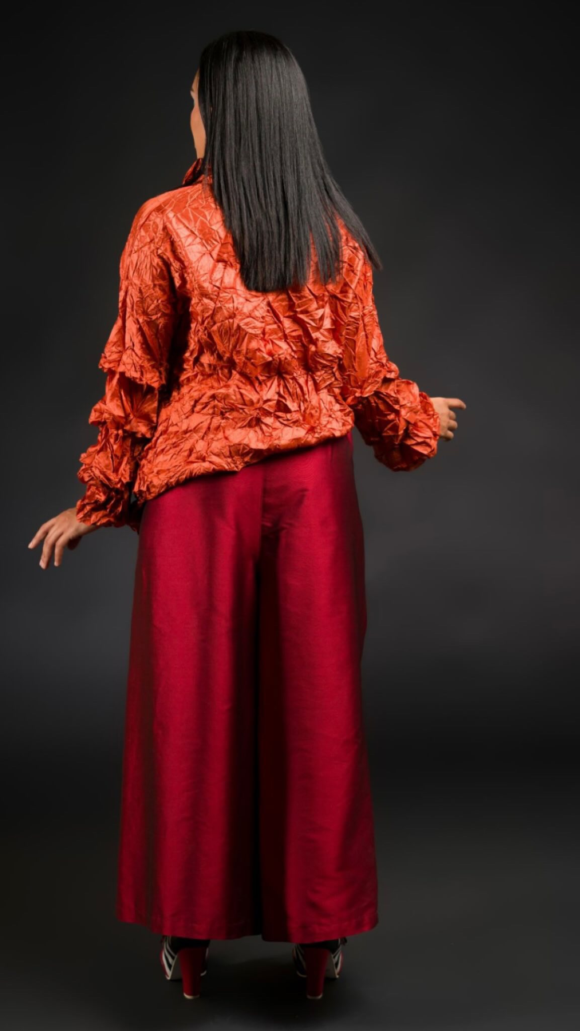 Camicia realizzato in morbida viscosa effetto stropicciato, dall’aspetto e senzazione della vera seta. Dalla linea dritta, con chiusura con bottoni, colletto classico, maniche lunghe a palloncino con piccole balze, taschino sul lato sinistro, laccetto decorativo e finta tasca a destra. Sul retro, carré e contropiega.