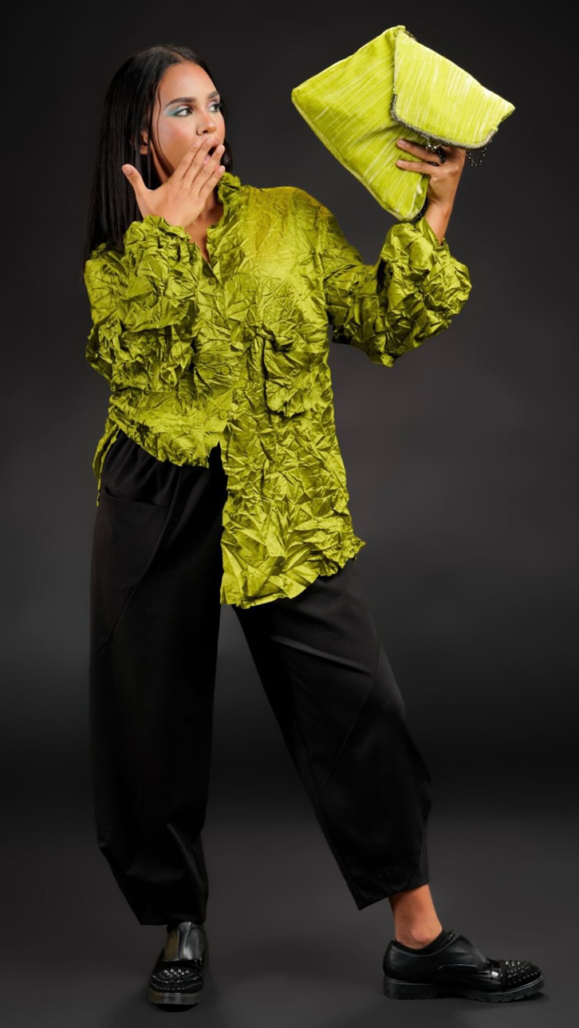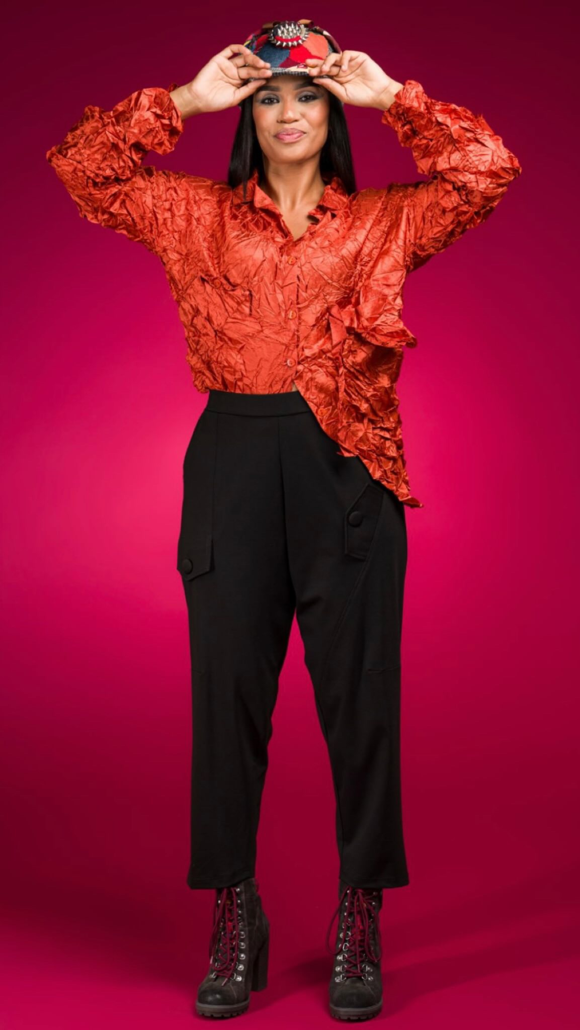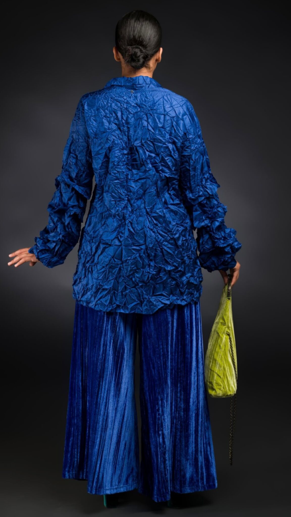 Camicia realizzato in morbida viscosa effetto stropicciato, dall’aspetto e senzazione della vera seta. Dalla linea dritta, con chiusura con bottoni, colletto classico, maniche lunghe a palloncino con piccole balze, taschino sul lato sinistro, laccetto decorativo e finta tasca a destra. Sul retro, carré e contropiega.