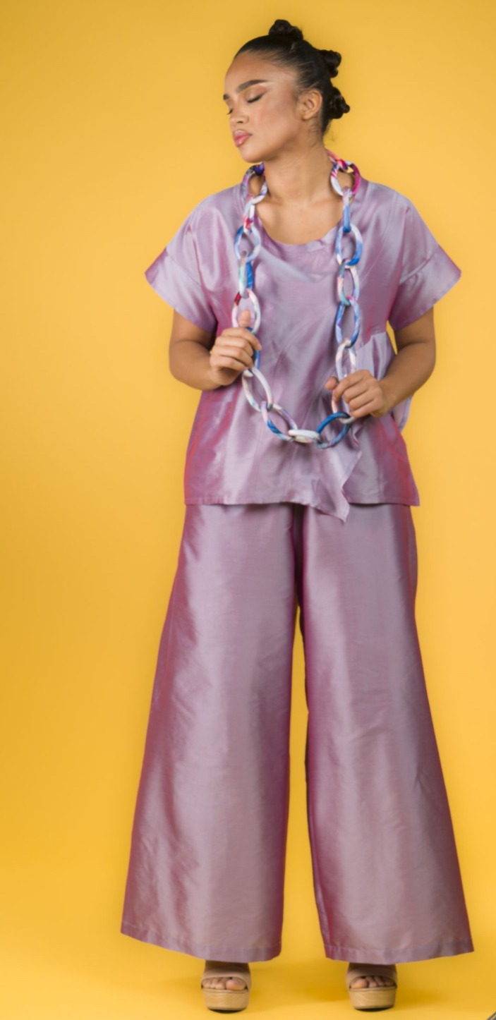 Pantalone elegante a palazzo realizzato in leggero taffetà 100% viscosa monocolore. Dal taglio comodo, a gamba larga, con tasche sui fianchi e vita elasticizzata.